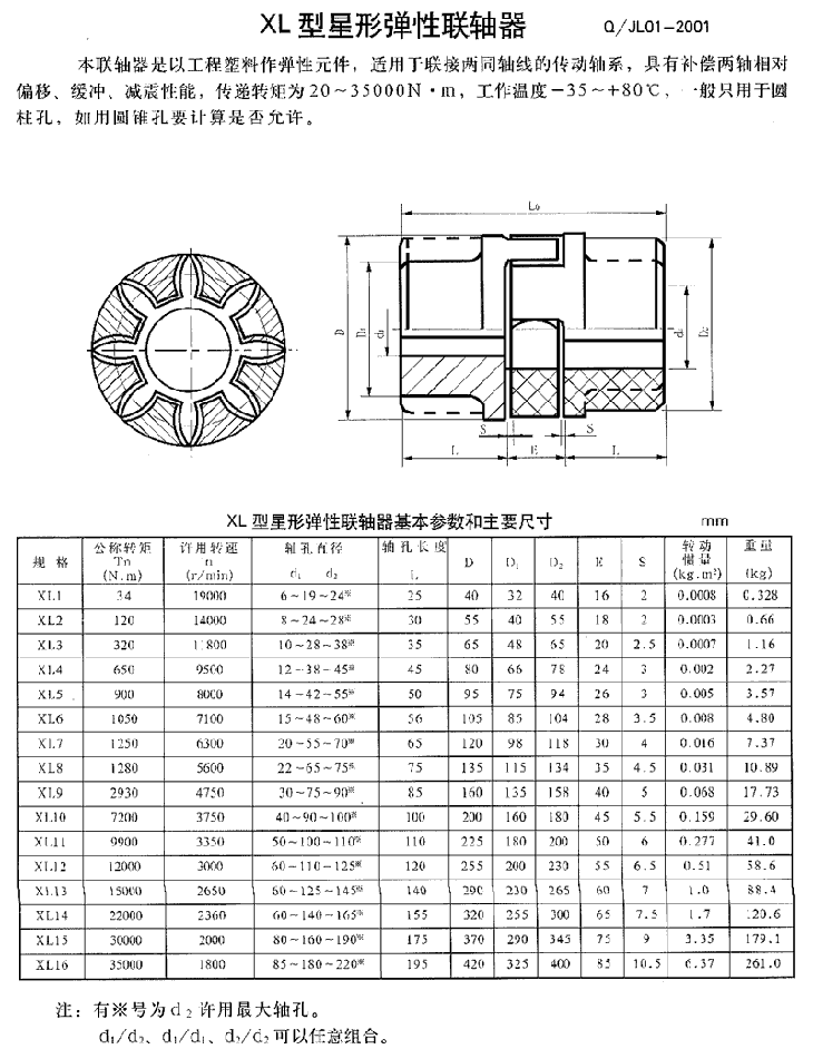 XL型星形弹性联轴器的适用范围和性能特点高弹性连轴器,泵套联轴器,LX(XL)型星形弹性联轴器 本联轴器聚氨脂弹性体由凸形爪块限制,可避免由于冲击产生的内部变形及离心力产生的外部变形;凸爪大的凹面,使渐开线齿上的表面压力很小,齿上即使承受过载,齿仍不会磨损或变形。 本联轴器是以工程塑料作弹性元件,适用于联接两同轴线的传动轴系,具有补偿两轴相对偏移、缓冲、减震、耐磨性能,适应场合普遍,传递转矩20-35000.N.M,工作温度-35-+80摄氏度并与德国ROTEX联轴器互换